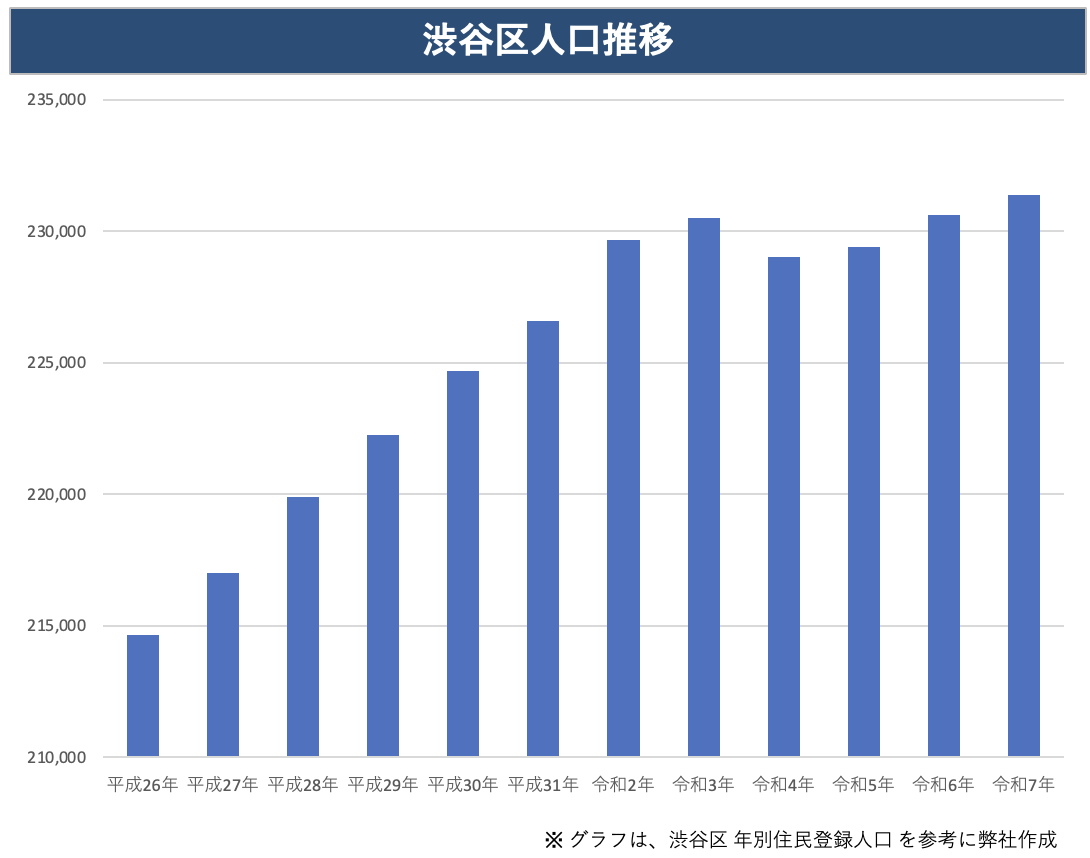 都市部では人口減少や高齢化が課題となる中、コロナ禍の一時期を除いて、渋谷区は一貫して 人口増加傾向を維持 しています。