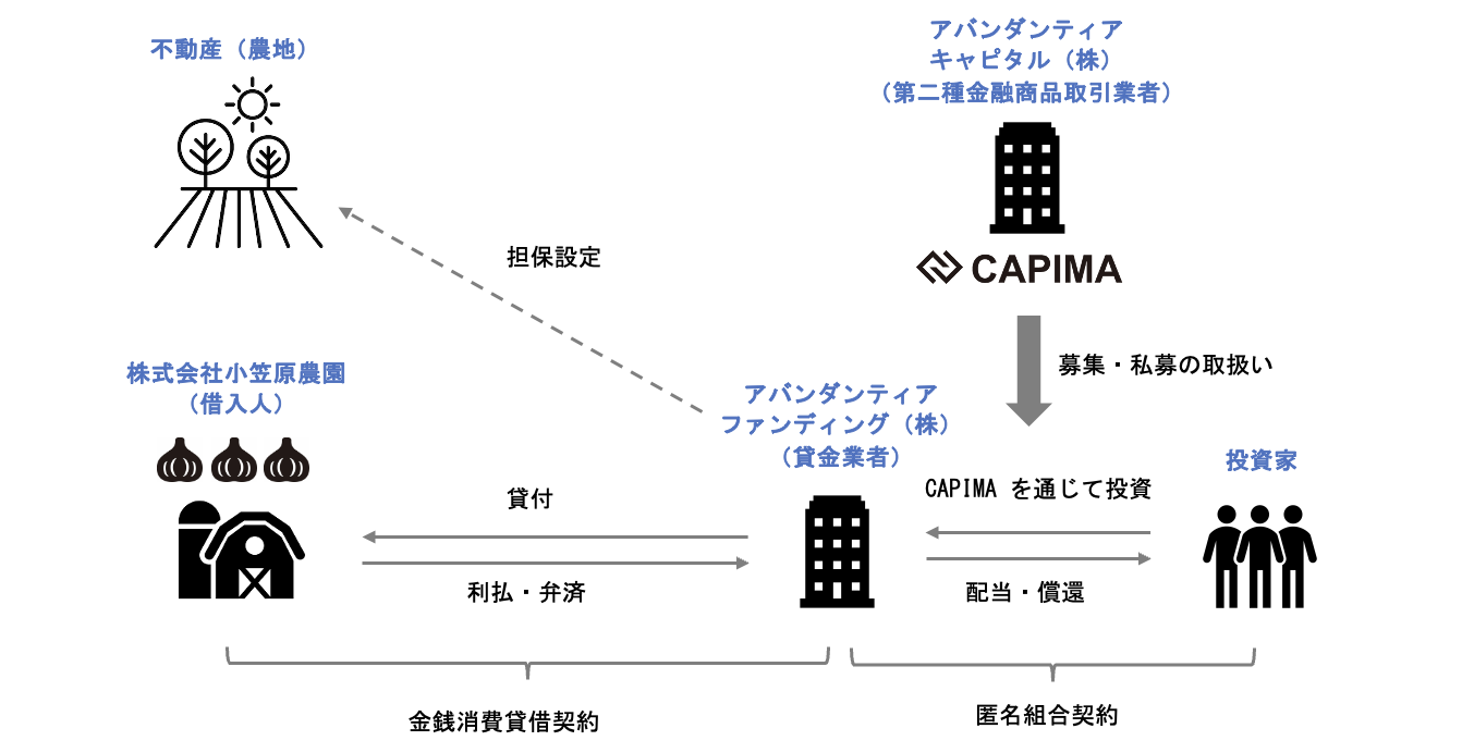 お客様は、弊社(アバンダンティアキャピタル株式会社 )が運営する貸付型クラウドファンディングサービスCAPIMAを通じて本ファンドに投資します。本ファンドの営業者は弊社100%子会社の貸金業者アバンダンティアファンディング株式会社であり、お客様が投資した資金を貸付先(株式会社小笠原農園 :青森県十和田市)に対して、青森特産の上質な熟成黒にんにくの栽培のために必要な「運転資金」等を資金使途として貸付を行います。