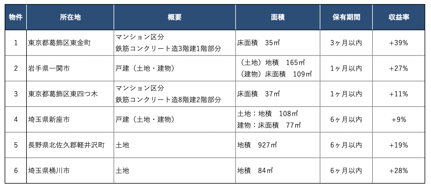 また購入から売却までの 保有期間は全て6ヶ月以内 と、当初の想定通り、比較的短期に売却し収益を上げることに成功しております。