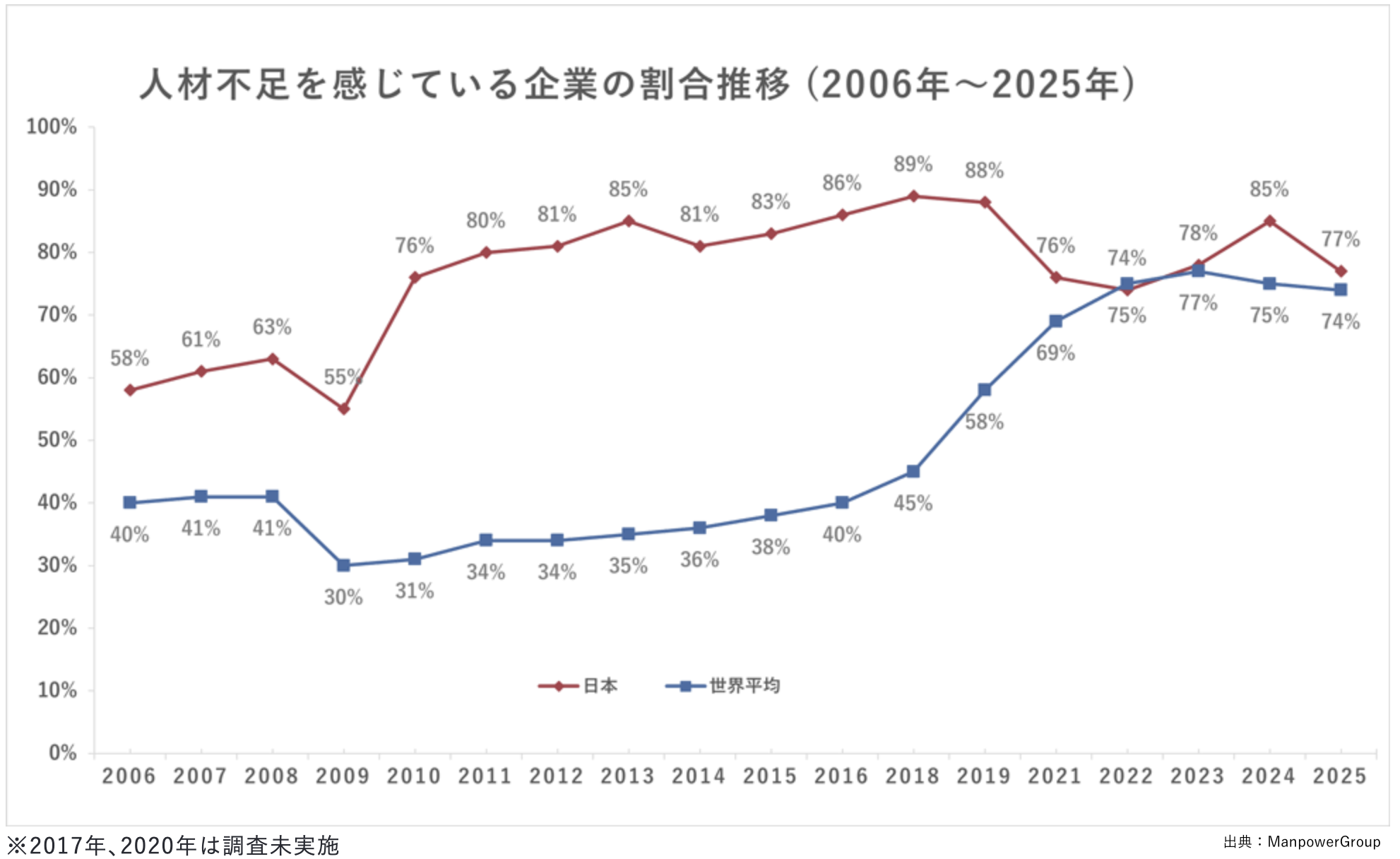 人材サービス大手ManpowerGroupが2025年に世界各国の企業を対象に実施した調査によると、必要なスキルを持つ人材を確保することが困難だと回答した企業は世界全体で74%に上りました。中でも日本企業の割合は特に高く、実に80%前後の企業が「人材を確保できない」と回答しています。これは調査対象国の中でもトップクラスの水準であり、少子高齢化の進行と労働市場の硬直性が重なった日本特有の構造的な問題を浮き彫りにしています。