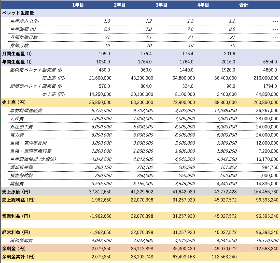 さらに付随的な収益源として、ペレット製造工程で生じる「おが粉」が牛舎の敷料(畜舎の床に敷くもの)として需要があり、安定的な収益が見込まれます。本ペレット工場における具体的な収支計画は以下の通りです。